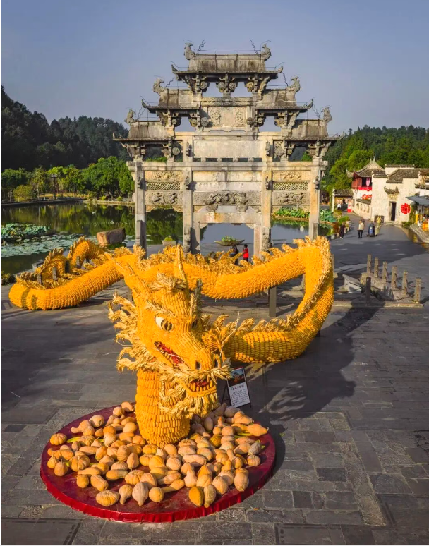 在世界最佳旅游乡村西递,一条由玉米堆砌而成的50米长巨龙蜿蜒于牌楼旁,五彩的晒秋景观与鳞次栉比的徽派建筑相辉映,吸引8.6万游客打卡,同比增长7.9%,成为X(推特)、Facebook(脸书)等国外社交媒体平台“顶流”,播放量超过83.5万次。