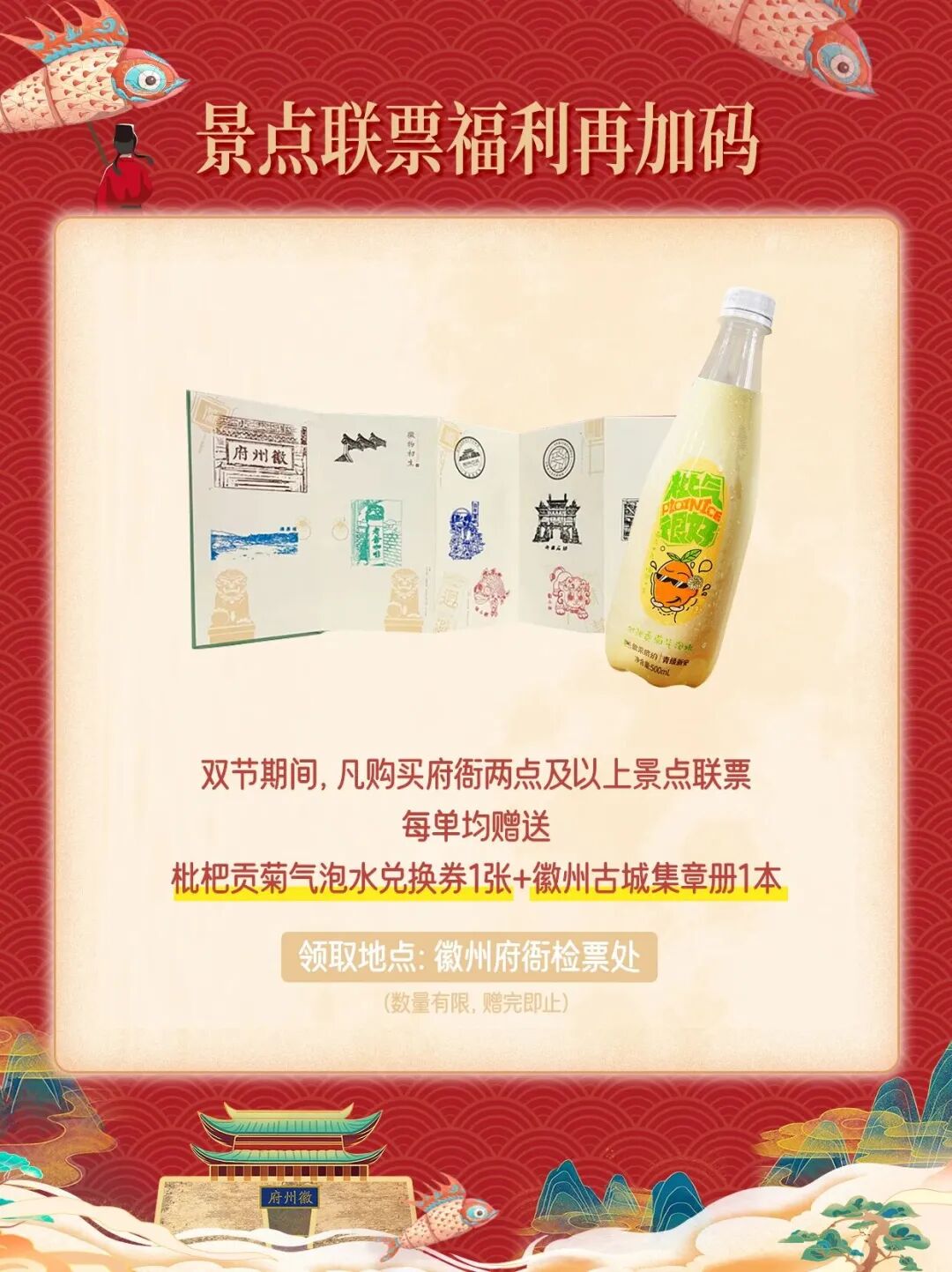 💡购府衙两点及以上联票,再送枇杷贡菊气泡水兑换券1张、徽州古城集章册1本和徽州府通兑银票!